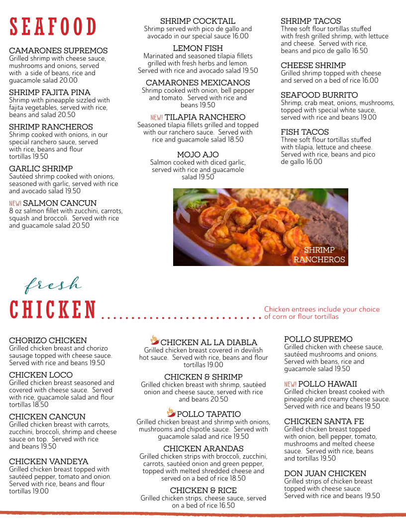 Shrimp cooked with onions, in our special ranchero sauce, served with rice, beans and flour tortillas